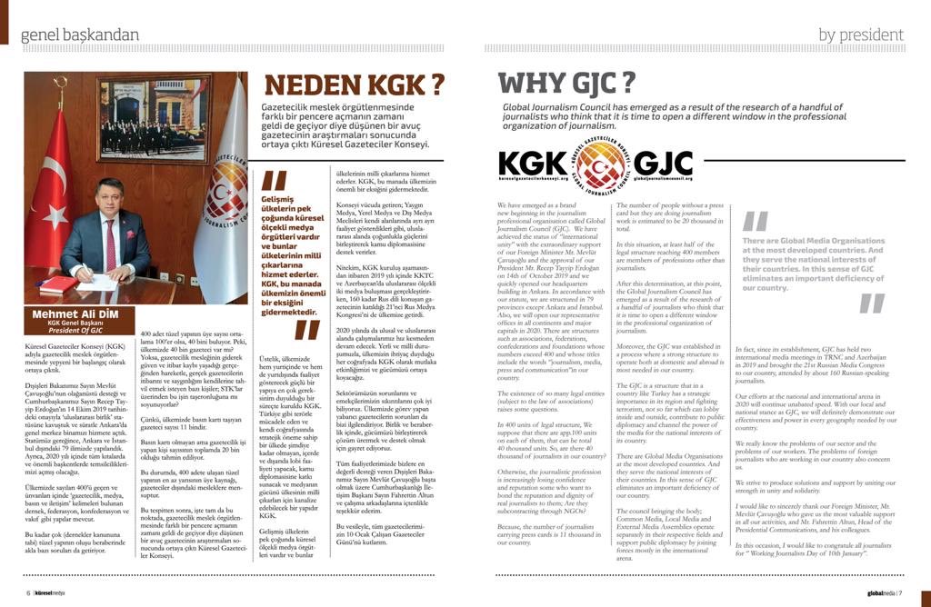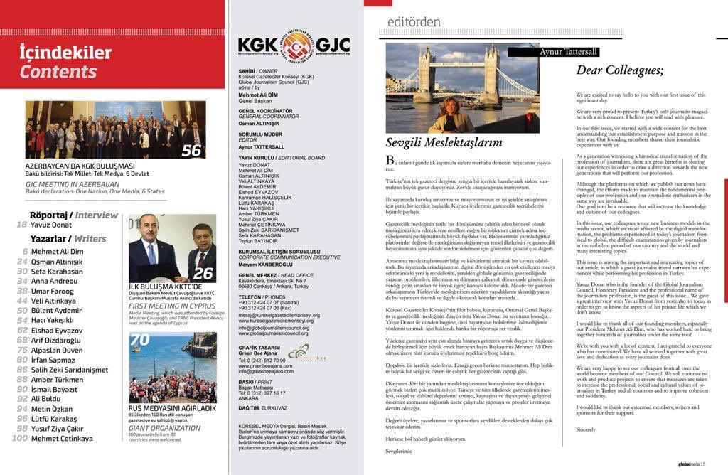 THE first issue of the Global Media / Global Media Magazine, the periodical of the GLOBAL Journalism Council (GJC), has been published today with a special edition of the ‘’Working Journalists Day’’. The magazine which includes news and articles on has ’’ Exclusive Journalism ‘’ will be available for sale at all distinguished dealers throughout the country as of tomorrow. The news and articles in the magazine are presented to the reader in Turkish and English languages. The President of GJC Mehmet Ali Dim said that ‘’ Wishing the Global Media Magazine, which is the product of intensive work to be beneficial to our community.’’.